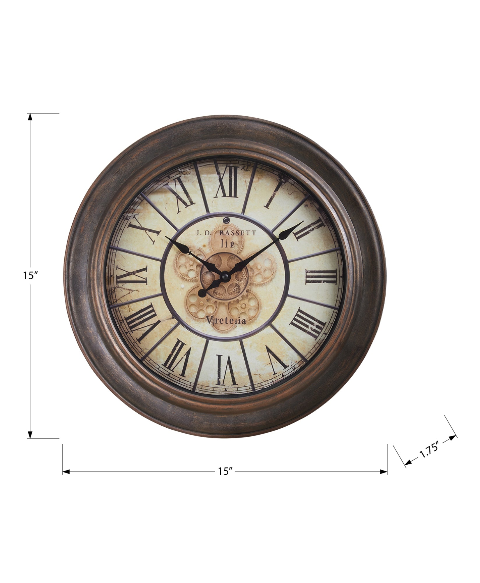 - An elegant, transitional style, 15' round wall clock in a vintage design, with a durable antique brown plastic frame and a quality glass surface.