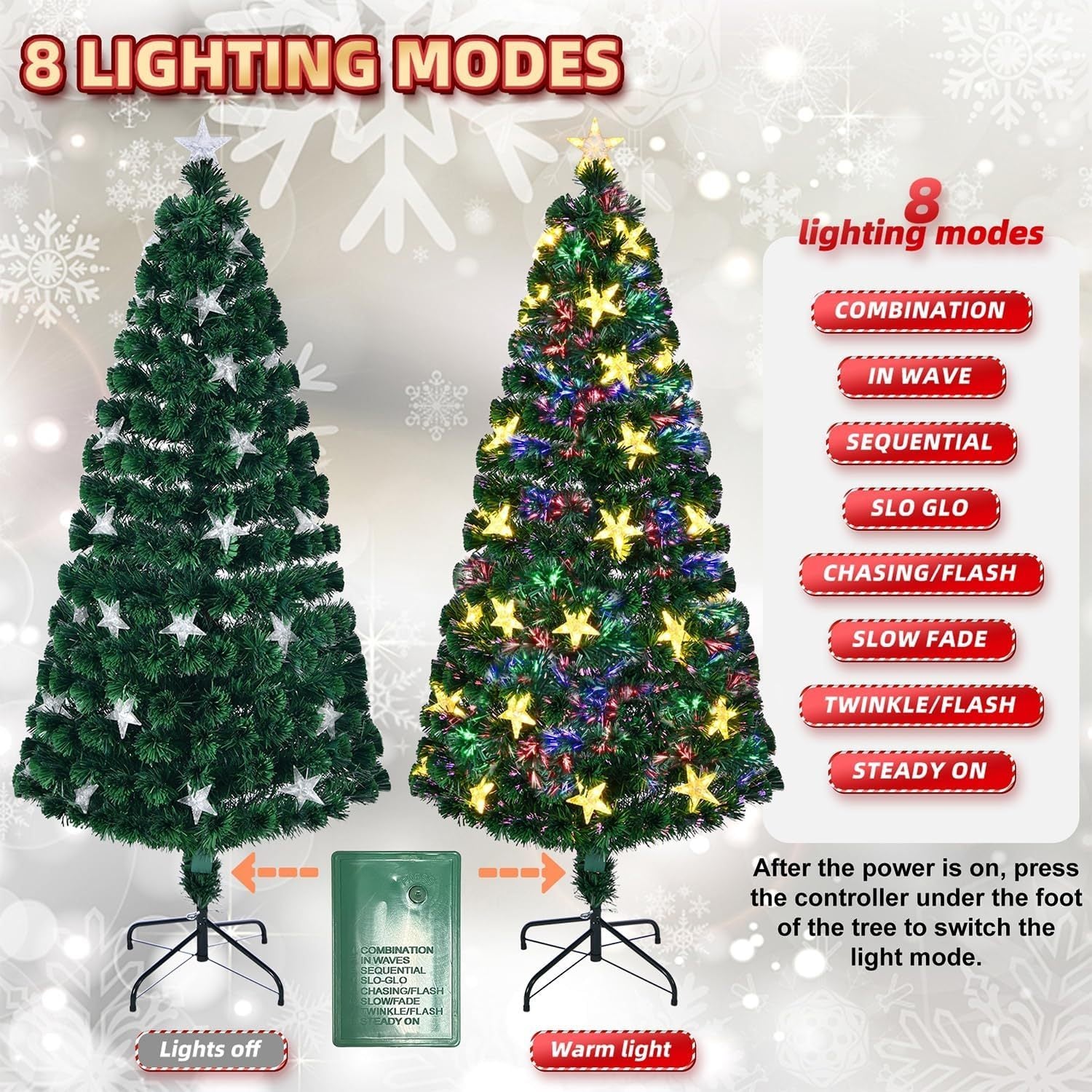 - 【Pre-lit Optical Fiber Christmas 】This Christmas tree is pre-lit with 185 LED warm white lights(5 LED in each star) and colorful optical fiber lights among the branches, creating a vibrant and mesmerizing nighttime display. The built-in lighting enhances nighttime visibility while emitting a captivating glow