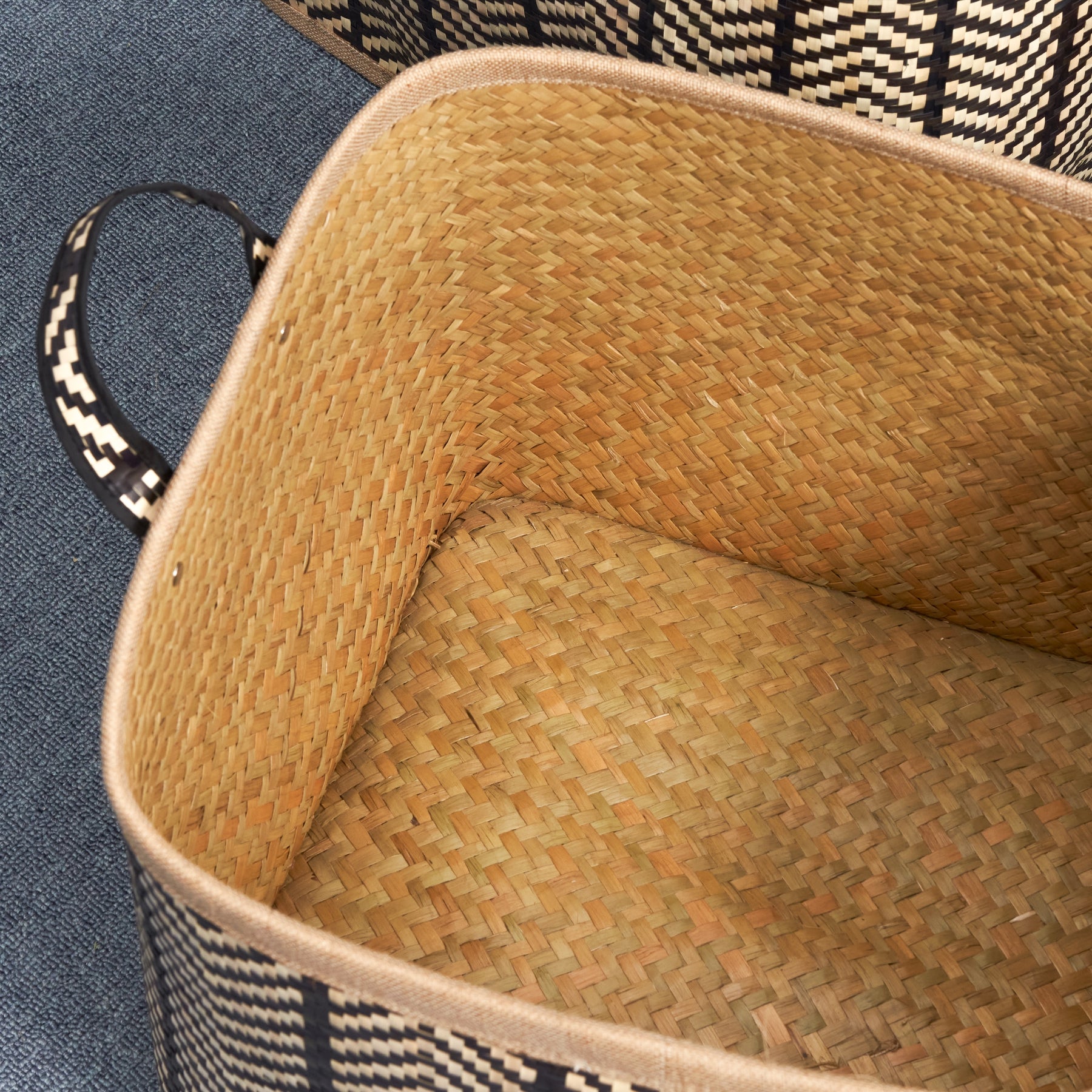 - Crafted from durable palm leaf, the baskets feature a timeless woven design in back and brown hues, adding a touch of natural elegance to your decor